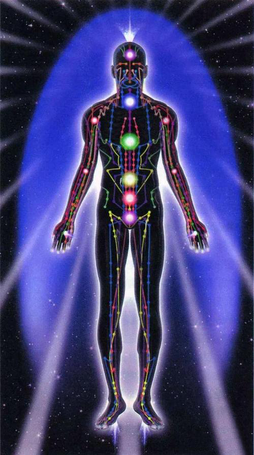 每个生物体都有生物电磁场发射的生物微波,都具有电磁波产生的“辉光”或者说是印度医学所指的“光轮”。在人体的中轴线上,有七个光亮点,分别对应着中医所说的印堂 、天突、膻中、神阙 、气海、关元 、曲骨7个穴位。除中轴线上7个大“光轮”外,肩膀里面 、肘部、膝内、手指尖和脚趾尖内等,还有许多大小不一的“光轮”。其中最明亮的三个“光轮”,对应的就是中医所说的“上丹田”、“中丹田”和“下丹田”。这些明亮的彩色线条编织成一张网络系统 ,与中医所描述的经络系统有许多重叠之处 。用物理学的话来说 ,许多“光轮”尤其是对应于“丹田”的那3个 ,就是波的“聚焦中心” 。